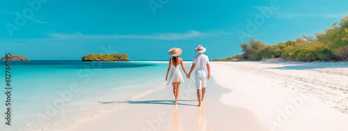 young couple walking on white sand beach on paradise island. Generative AI,
