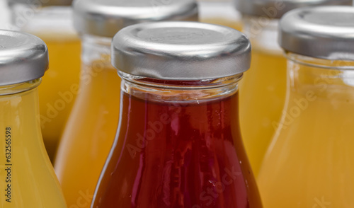 Szklane butelki ze srebrnymi nakrętkami, soki owocowe