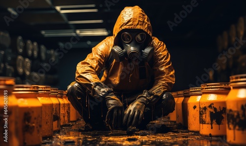 Osoba w żółtym kombinezonie ochronnym oczyszcza odpady radioaktywne.