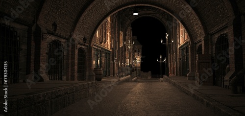 Steampunk street with arch at night. Lanterns illuminating old brick buildings. Beautiful night cityscape in a steampunk style. Photorealistic 3D illustration.
