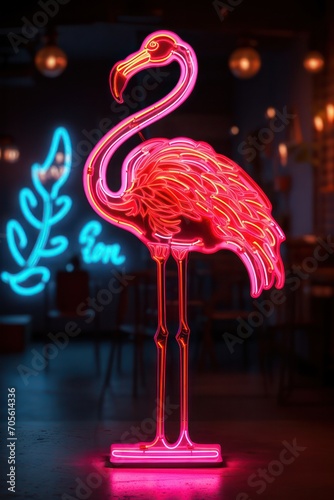 trendy neon pink flamingo bird sign glowing on a wall of a bar or restaurant on blue background