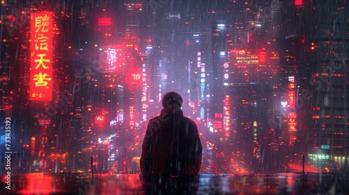 Mężczyzna stoi nocą w deszczu przed miastem pełnym neonów, bilbordów i świateł