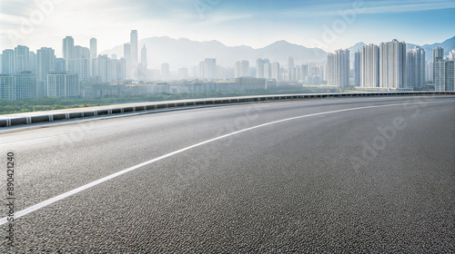 Curved asphalt road leading to a modern city skyline. Urban landscape background with copy space
