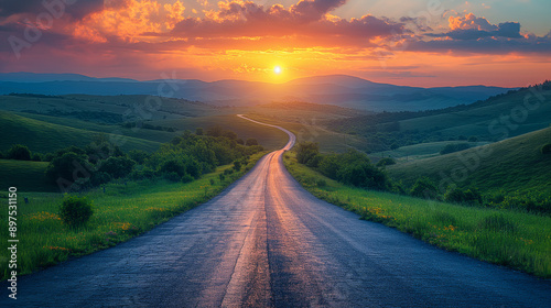 Asphalt highway road and green mountain with sky clouds at sunset