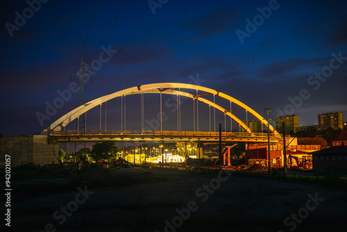 Nowoczesny most łukowy oświetlony nocą na tle ciemnego nieba