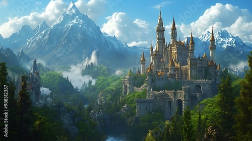 A fantasy kingdom in 4D animation with evil queens ruling over animated elves, fairies, and magical animals, with enchanted castles towering over mystical forests
