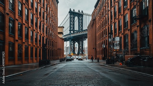 Manhattan Bridge in New York City, view from the street between brick buildings, New York City, Architectural photography.