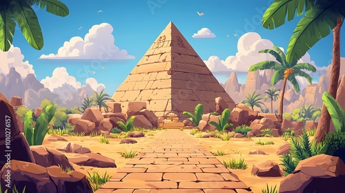 Ancient Egyptian Pyramid with Palm Trees and Desert Landscape Illustration