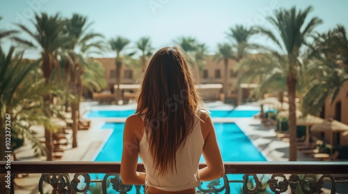 Hotel Balcony with Young Woman Enjoying Pool View in Tropical Egypt Resort