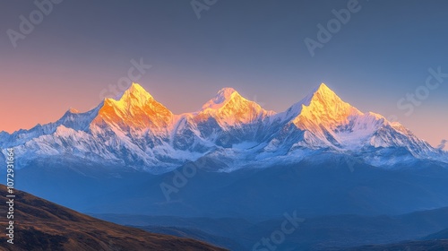 Snowy peaks of Meili Snow Mountain range (Kawagebo), Yunnan, China, at sunrise, with warm golden light illuminating the sharp, rugged, snow-capped peaks against a clear sky
