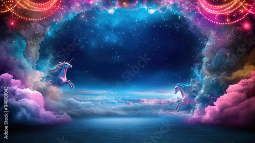 Circus theme with magical unicorns fantasy landscape and copy space for banner background