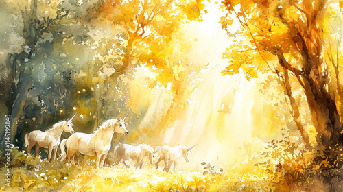 Watercolor illustration of unicorns grazing in golden forest