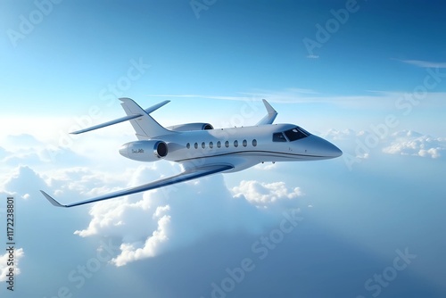 Luxury private jet at flying under blue sky with clouds. copy space for text