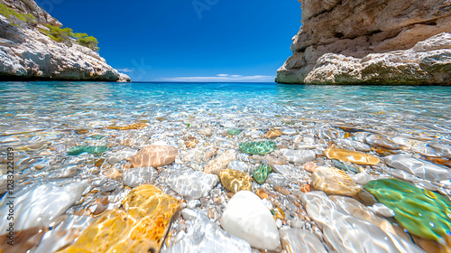 Crystal-clear beach, colorful pebbles, calm sea, sunny day, travel brochure
