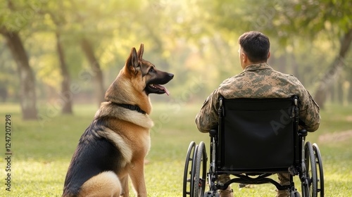 German Shepherd Therapy Dog Calmly Sitting Next to Disabled Veteran - A soldier in a wheelchair finds comfort with a German Shepherd in a serene park, symbolizing companionship, support, healing