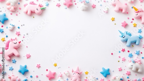 A playful arrangement of unicorn figurines and colorful stars on a white background.
