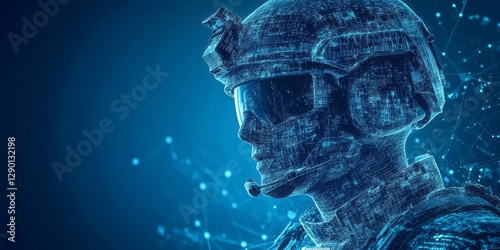 Digital soldier with helmet and futuristic technology on blue background
