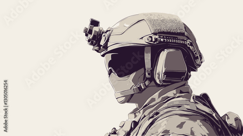 Close-up profile view illustration of a soldier wearing a tan helmet with attached headgear and a camouflage uniform. The illustration style is stylized and uses a limited color palette of