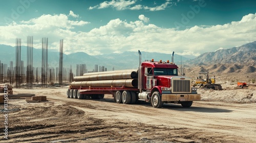 A red flatbed truck hauling metal pipes through a construction area, emphasizing heavy-duty transport and the importance of infrastructure projects.