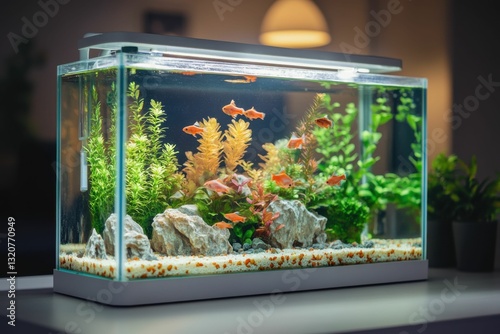Aquarium On Table. Beautiful Room Decor with Animal Life in Water Environment