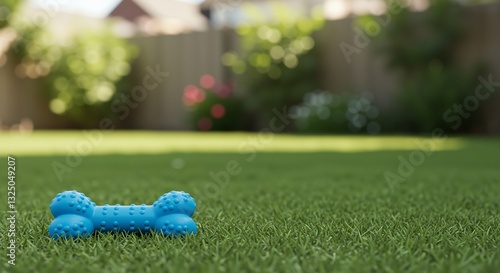 Blue dog toy lying on green grass, evoking a playful and inviting atmosphere, symbolizing pet enjoyment and care, with a blurred garden background featuring colorful flowers