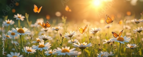 Sunlit daisy field with butterflies. Chamomile flowers bloom on a summer meadow in nature. Panoramic banner of spring season, orange monarch butterflies flutter on daisies.