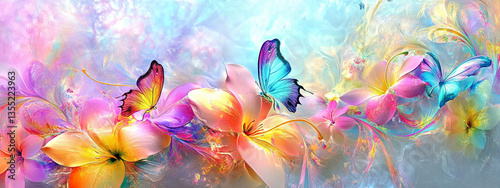 Wiosenny baner z kwiatami i motylami, kolorowe tło dla projektu generative ai