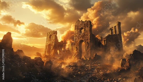Whispers of Forgotten Empires: Crumbling Ruins Silhouetted Against a Golden Sky