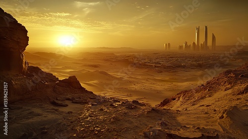 A stunning vista of Riyadh at sunset, the city bathed in a golden glow, skyscrapers like the Kingdom Tower and Faisaliah Tower towering over the skyline, long shadows stretching across the desert