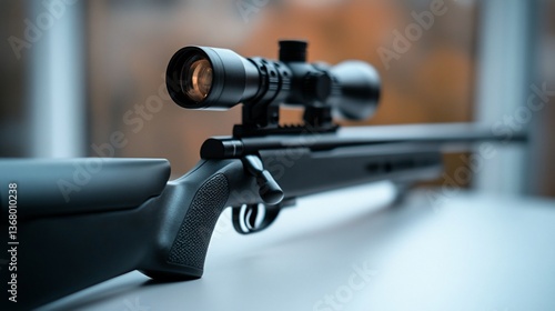 Precision rifle with magnified scope resting on a neutral surface in soft light
