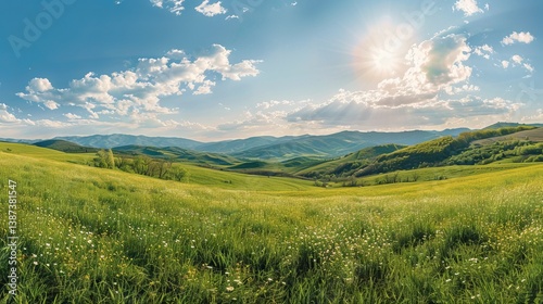 Panorama of rolling hills and grassy meadows in rural romanian mountains