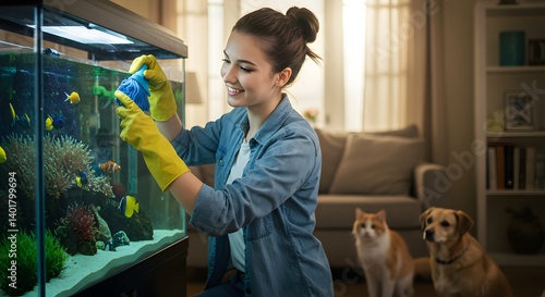 Woman Cleaning Aquarium with Fish and Dogs Watching in Living Room