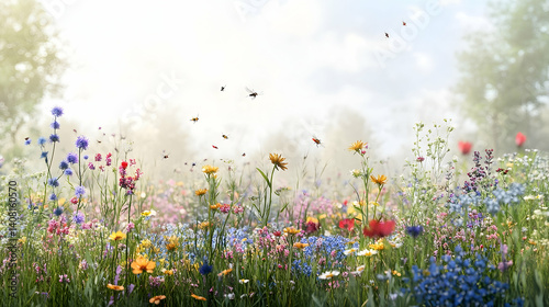 A vibrant meadow blossoms under a soft, sunlit sky.