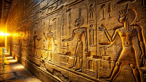 Ancient Egyptian Hieroglyphs: Weathered Stone Wall in Golden Light