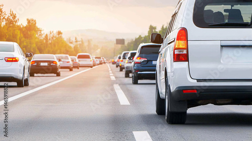 Cars are driving du a traffic jam on the highway as the sun shines du the day.