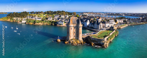 France , Brittany travel and landmarks. aerial view of Solidor tower and medieval city of Saint Malo. Popular tourist destination and attraction.