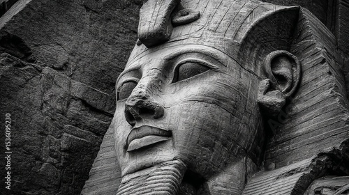 Ancient Egyptian Pharaoh Stone Carving Majestic Head Black White Granite Sculpture Powerful Pharaoh Royal Headwear Imposing Figure Historical Artifact Timeless Monumental Art Old