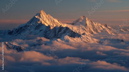 Sunlit snow-capped mountain peaks emerging above low clouds, golden sunrise light