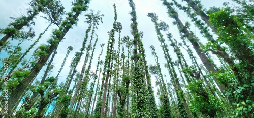 A scenic view of a traditional coffee plantation surrounded by tall silver oak trees in a hilly region of South India.