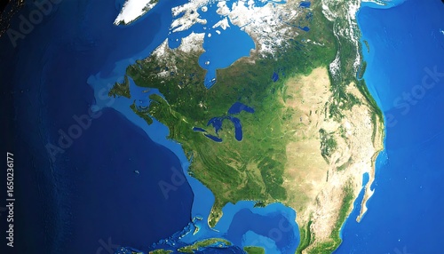 Satellite view of North America, showcasing diverse geography, from snow-capped mountains to coastal regions