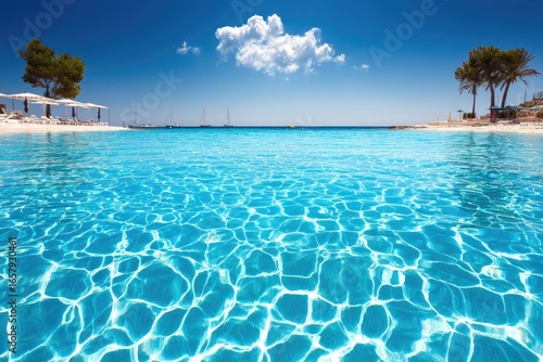 Tranquil azure beach vista, crystal-clear water
