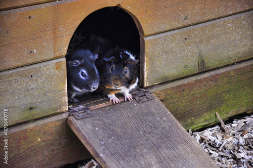 Urocze świnki morskie wychodzą ze swojego przytulnego, drewnianego schronienia, eksplorując światło dzienne. To zdjęcie ukazuje ciekawość i urok małych zwierząt w ich naturalnym środowisku.