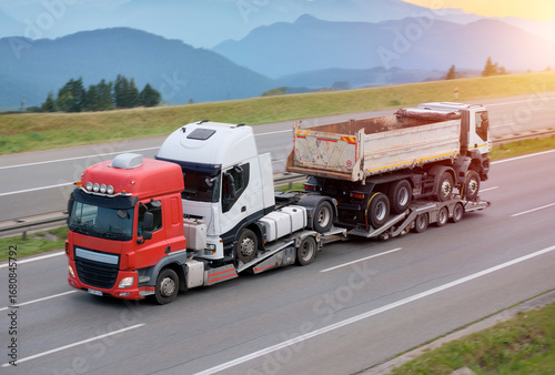 Heavy-Duty Vehicle Transporting Two Semi-Trailer Trucks