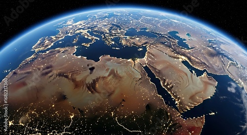 A detailed view of the Earth, highlighting the Middle East and North Africa region at night, showing city lights and desert landscapes.