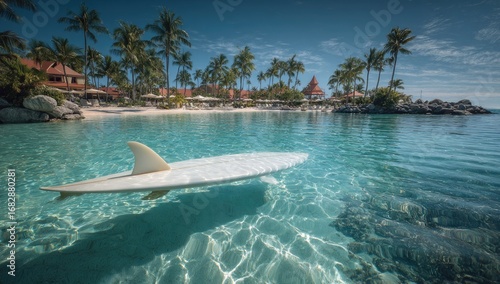 Tranquil tropical beach scene with a surfboard resting in clear turquoise water. Palm trees line a sandy beach, and buildings are visible in the background