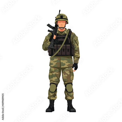 A standing soldier in camouflage gear, holding a rifle, with a serious expression.