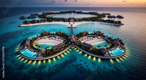 Aerial view of luxurious tropical island resort in maldives with ocean villas and turquoise water at sunset
