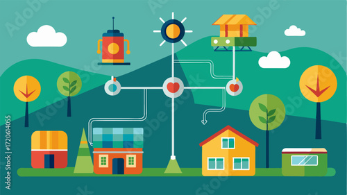 A smart grid connecting multiple farms in a region allowing for better energy distribution and sharing.. Vector illustration