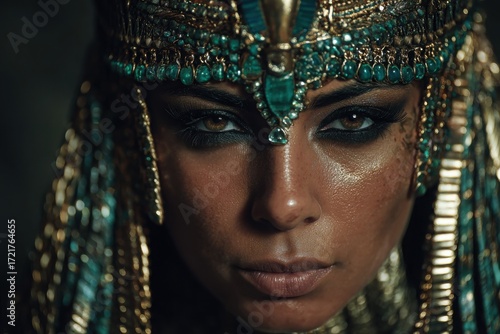 A stunning portrait of an Egyptian queen, adorned in intricate jewelry and regal attire, emanating an aura of power and mystique. Her eyes are captivating.