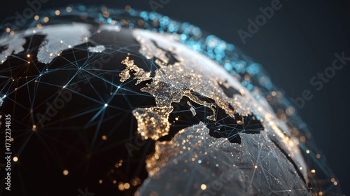 a global digital network connecting points across a map of europe. a satellite view of earth is overlaid with the continents, showcasing fiber optic connectivity throughout the regions